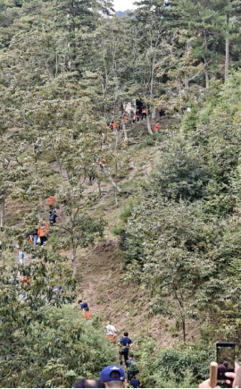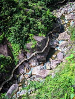 上午十一时整,我们正式踏上这条千年古道。起步便是连续五公里的陡峭上行路段,山势险峻,道路崎岖难行。沙石路面因年代久远而斑驳不平,一侧是看不到顶的高山另一侧是深不见底的山谷。同学们最初的新鲜感很快被严峻的现实取代,每向上攀登一步都需要付出巨大努力。