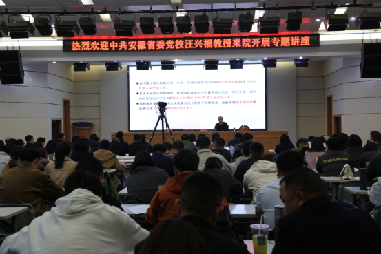 为帮助MBA学生进一步领悟党的二十届四中全会精神,学习“十五五”规划《建议》,近日,学院特邀中共安徽省委党校(安徽行政学院)马克思主义学院原院长汪兴福教授担任主讲嘉宾,开展了一场以“中国式现代化进程中的“十五五”规划《建议》——学习贯彻党的二十届四中全会精神”为主题的专题讲座。讲座由学院教学督导朱学平教授主持,学院党支部、安徽省MBA学会、24级、25级MBA和历届校友约240余人到场学习。